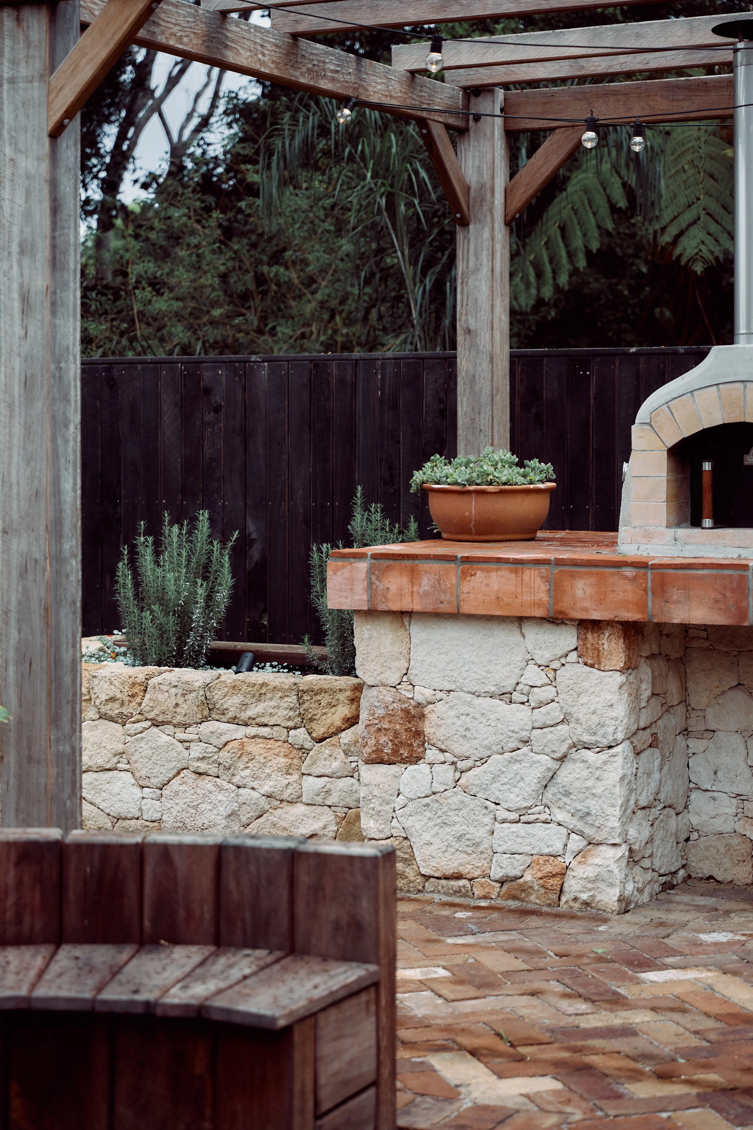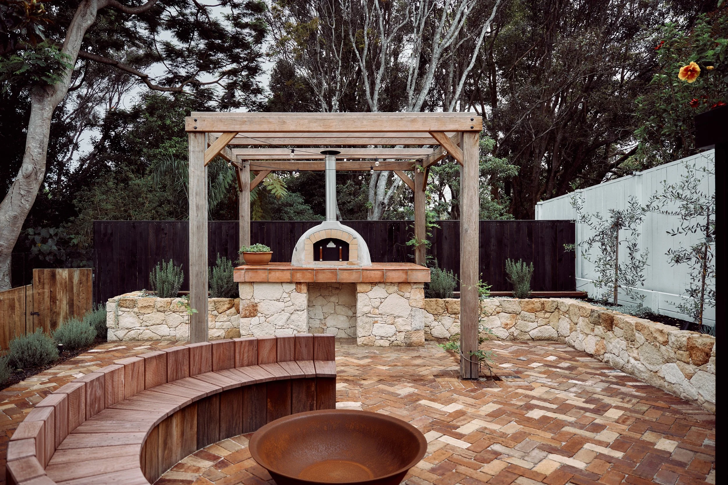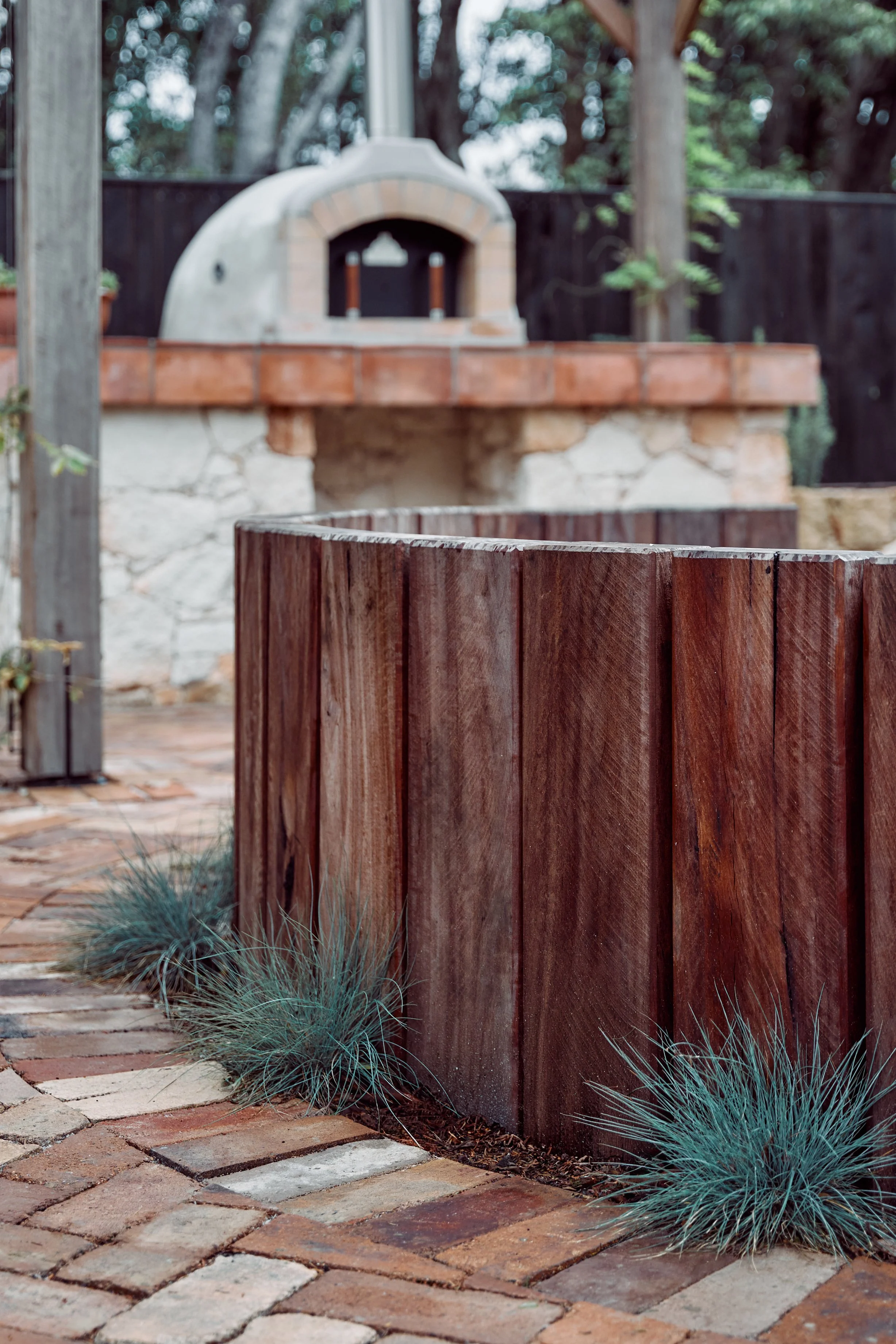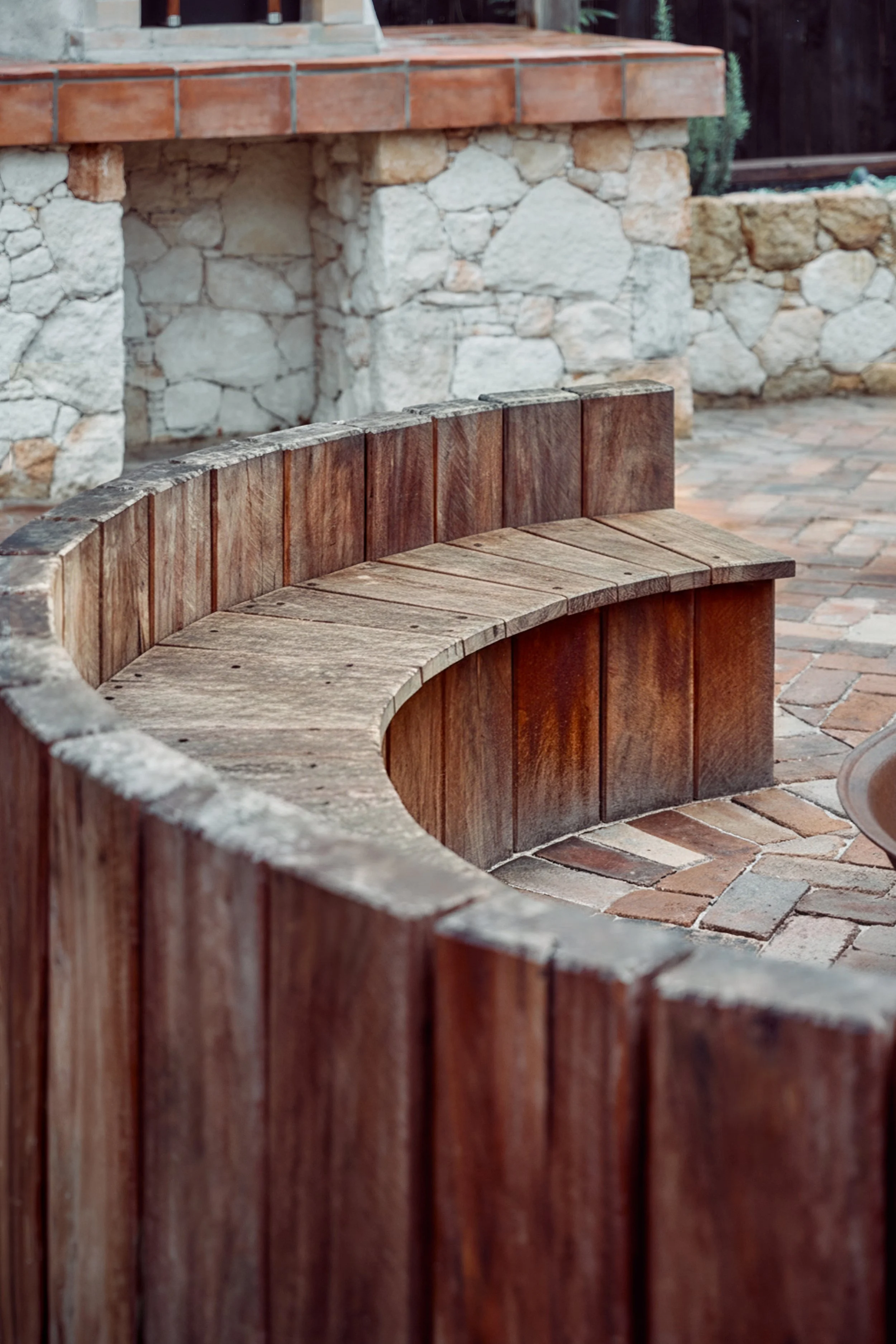Red ironbark slabs and board curved bench seat centred in front of stone clad raised garden beds with pizza oven on terracotta tile bench, beneath the red ironbark arbor