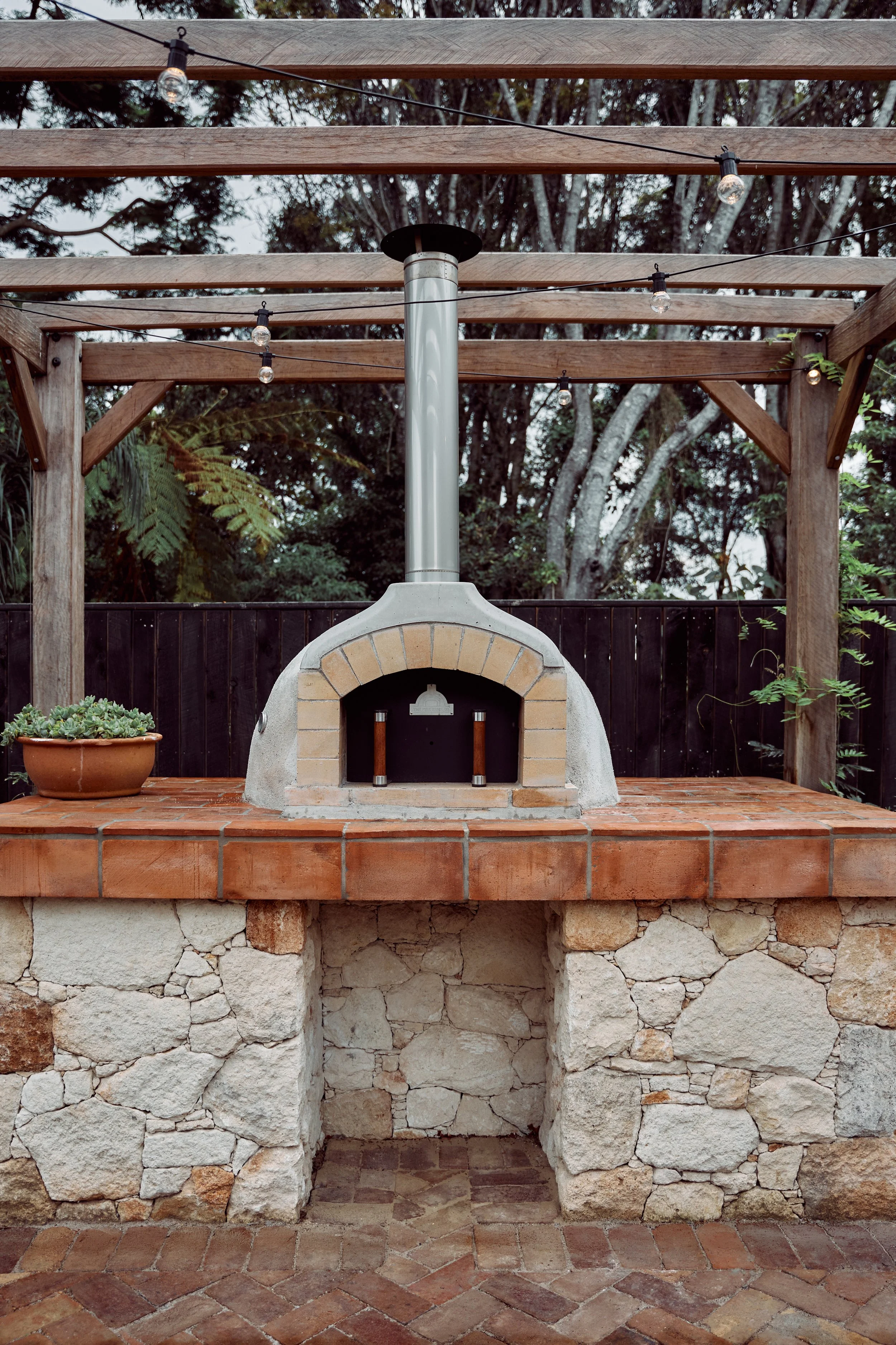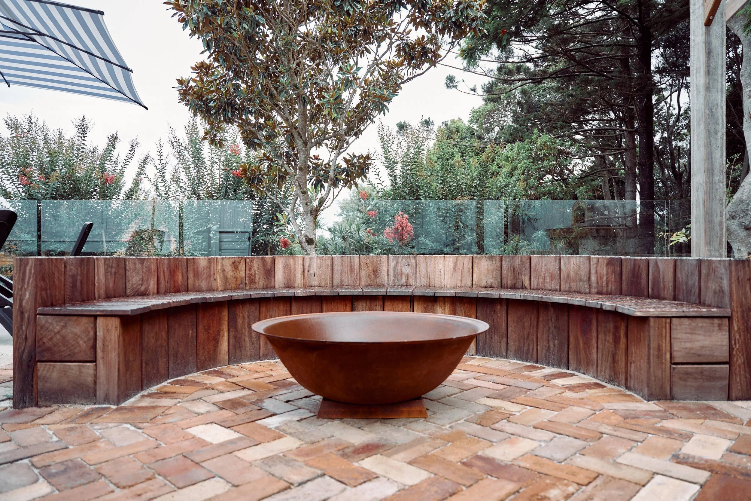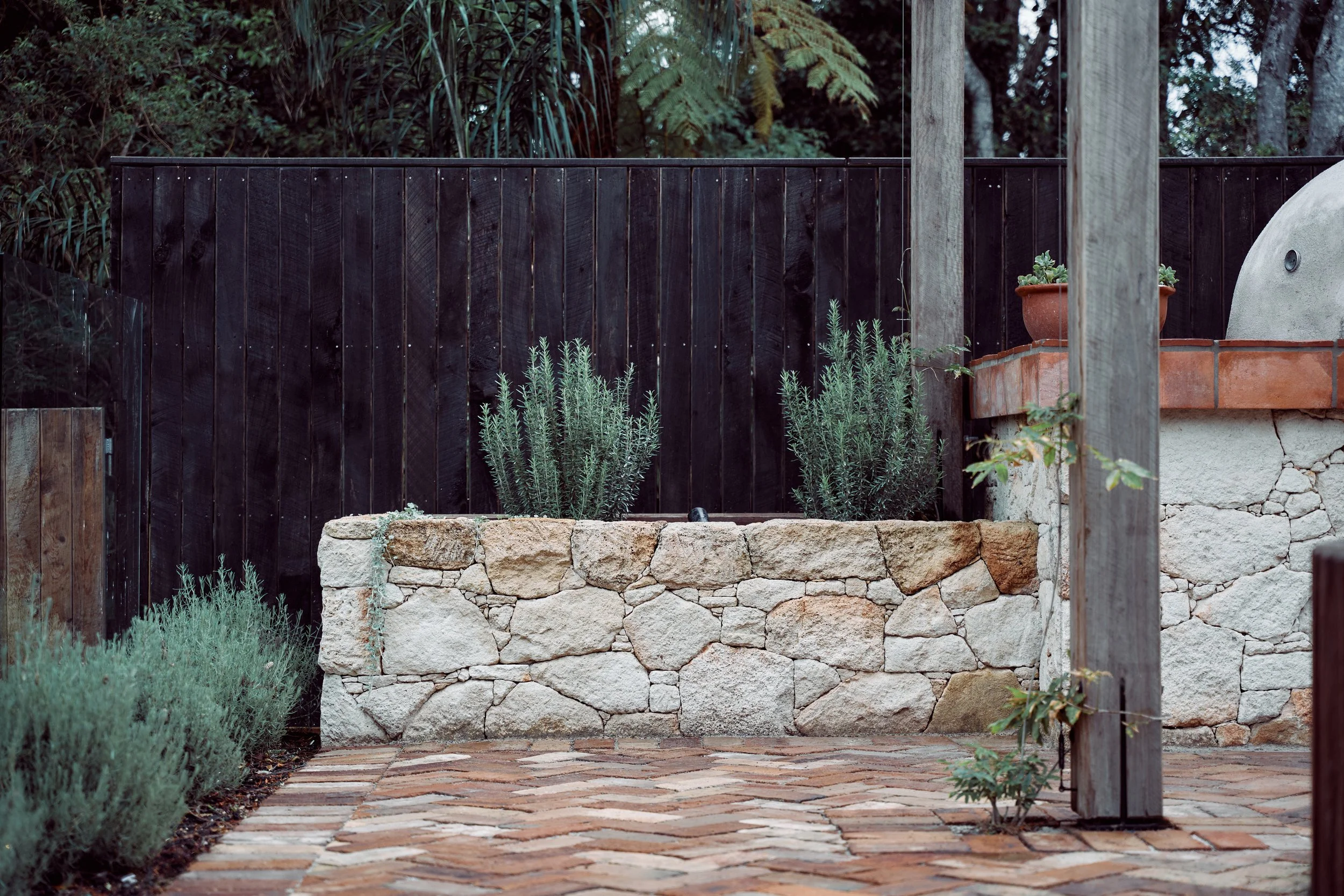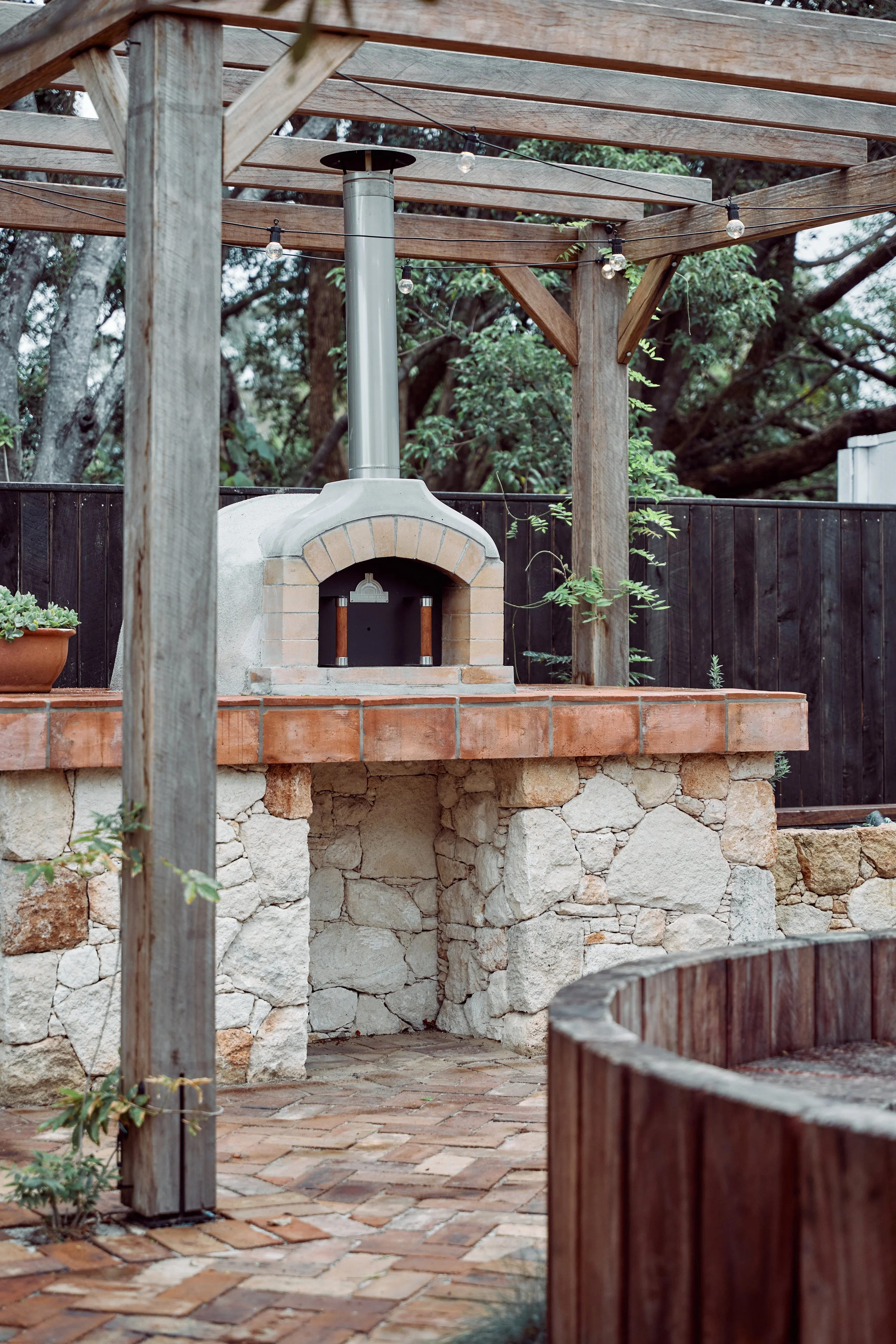 Red ironbark slabs and board curved bench seat centred in front of stone clad raised garden beds with pizza oven on terracotta tile bench, beneath the red ironbark arbor