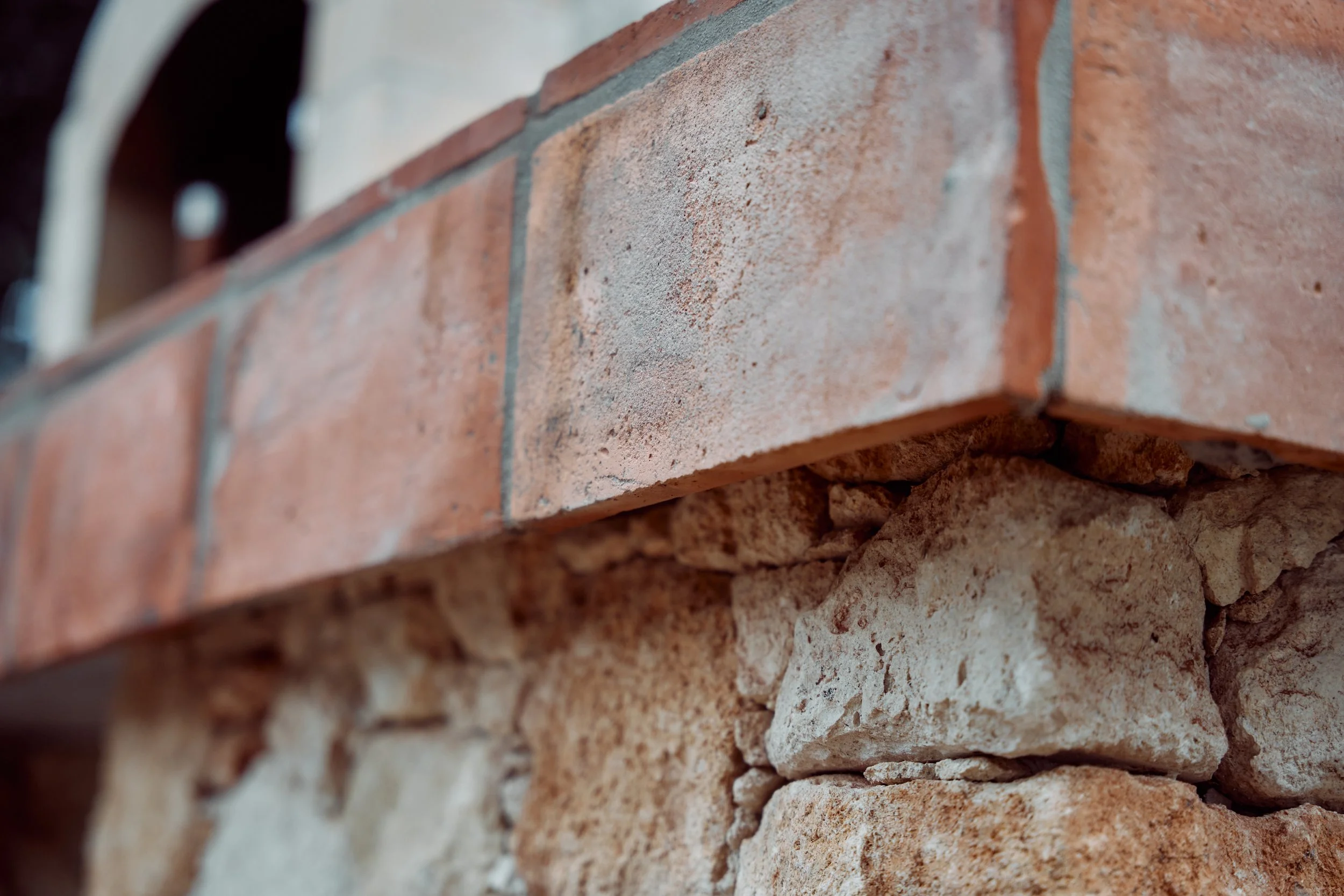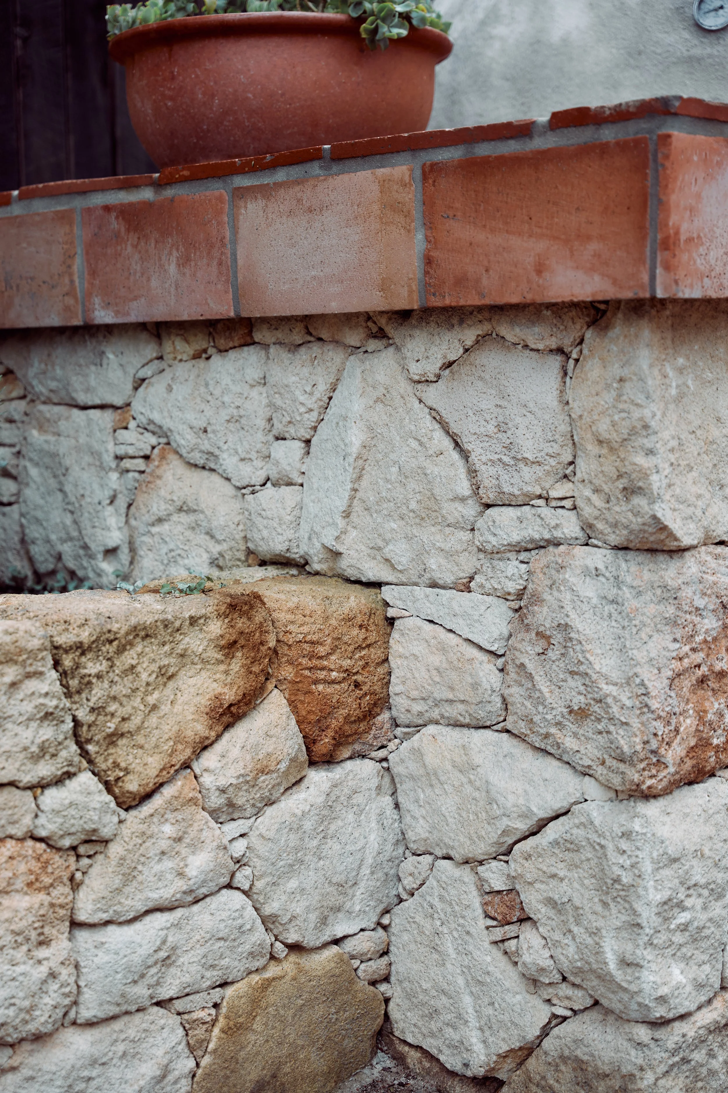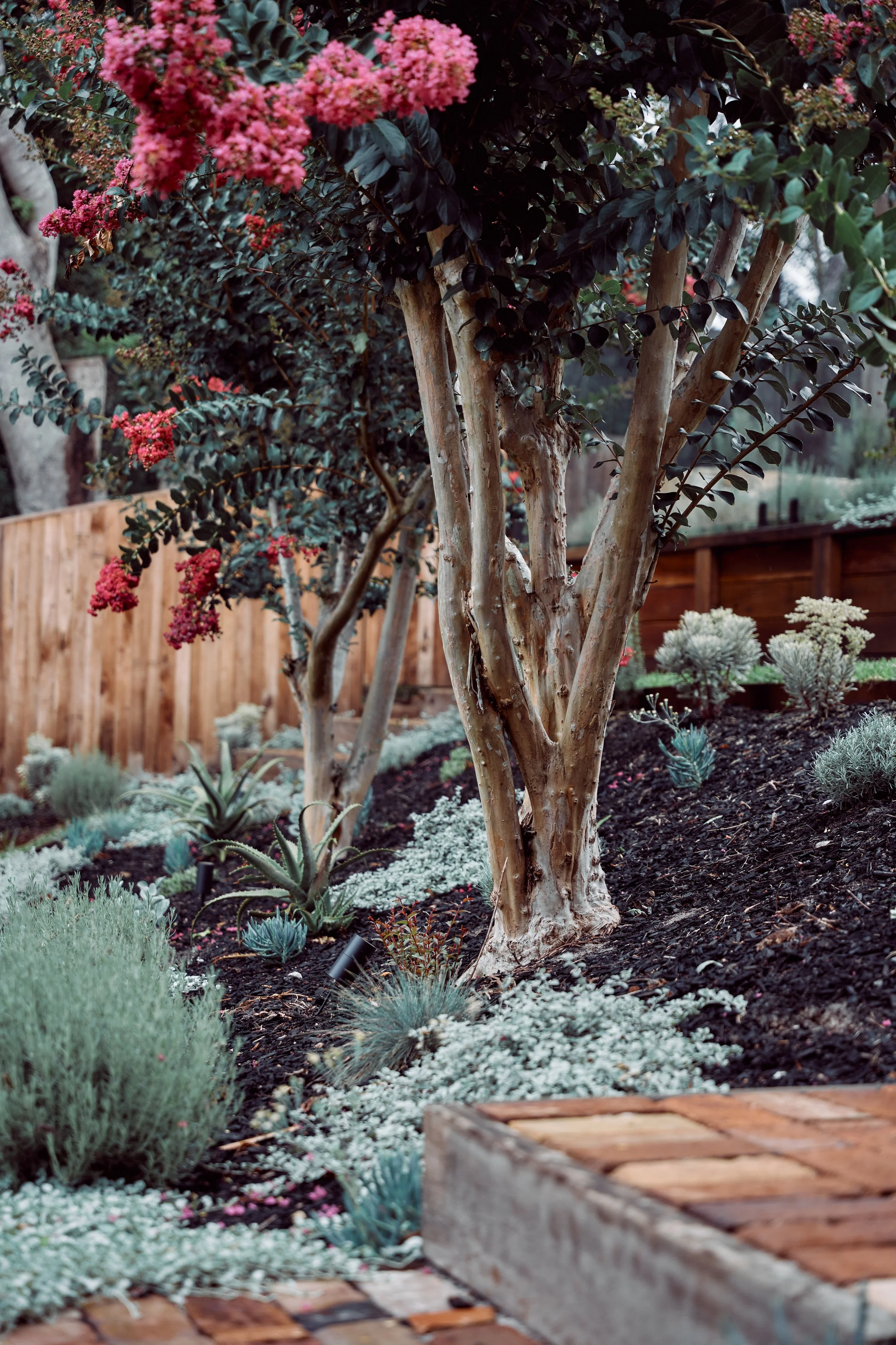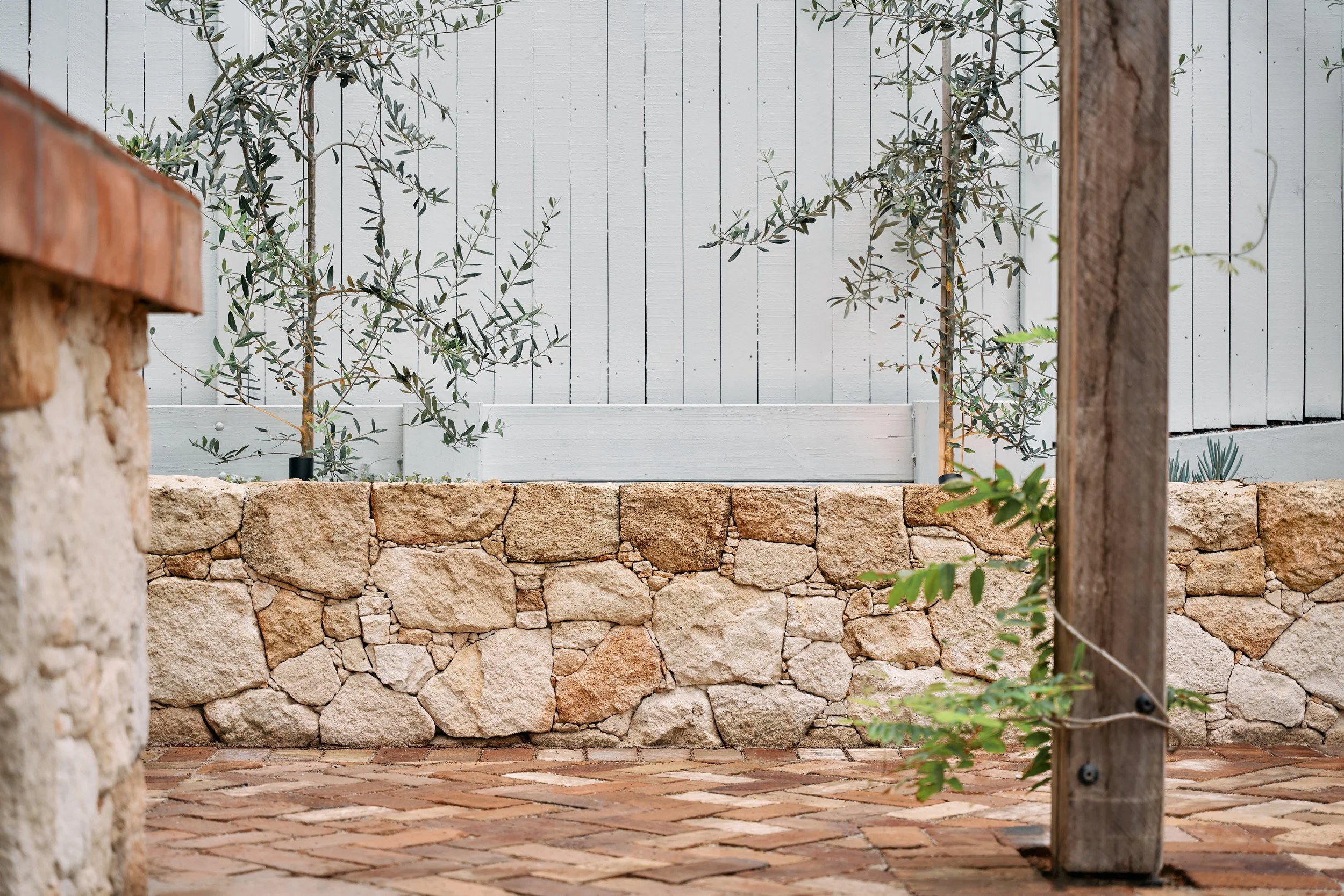 Red ironbark slabs and board curved bench seat centred in front of stone clad raised garden beds with pizza oven on terracotta tile bench, beneath the red ironbark arbor